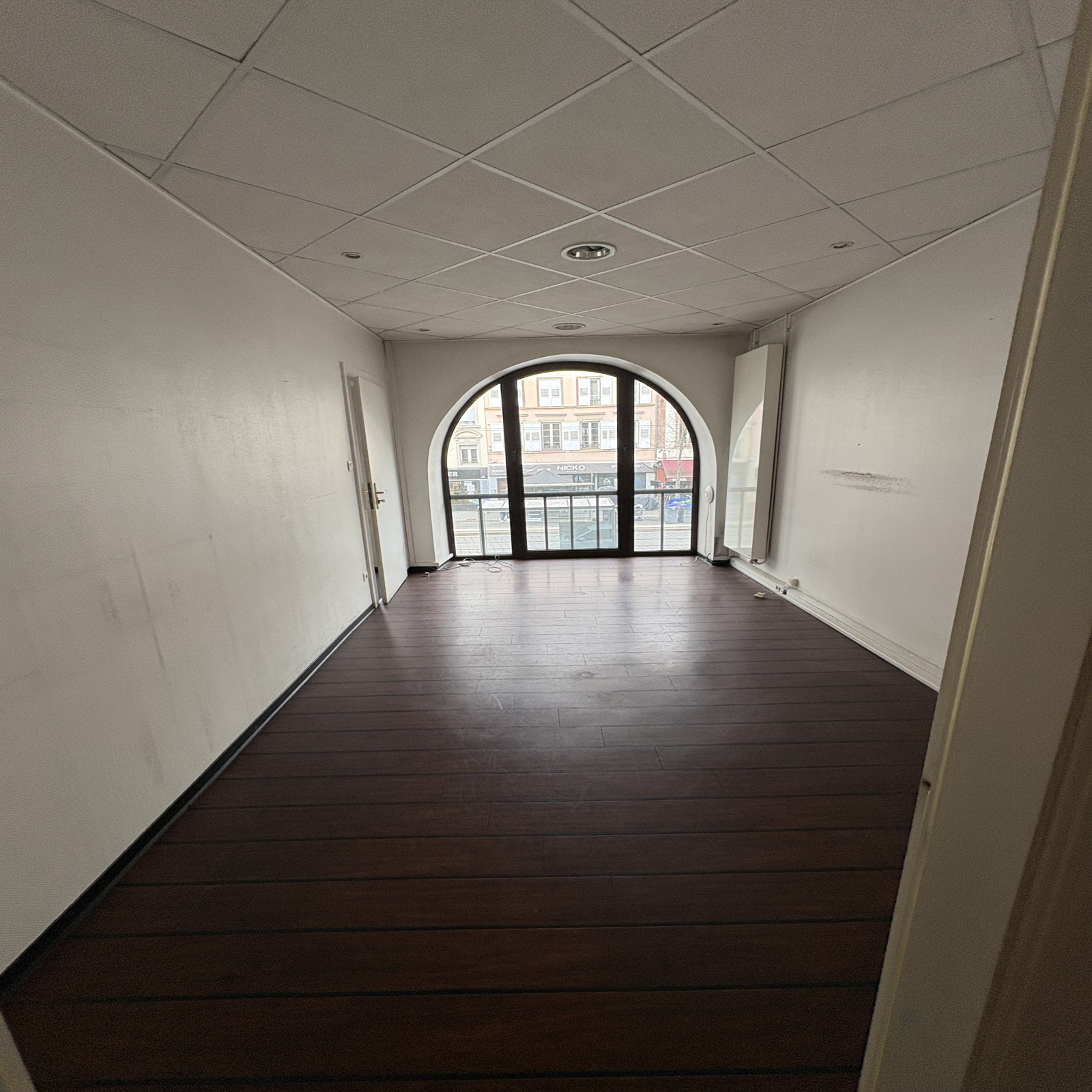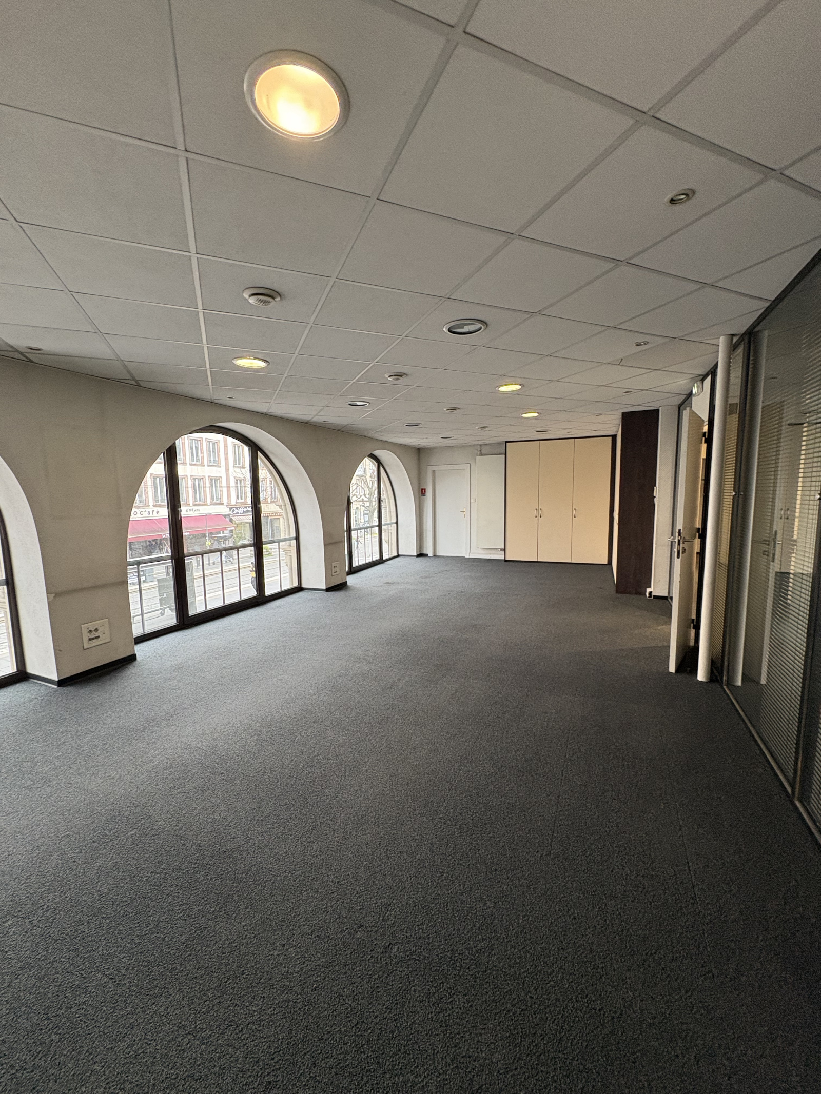 Proche des halles, de la gare, du centre-ville, face arrêt de tram, dans bel immeuble, à louer local professionnel / commercial de 124.88m², au 1er étage avec ascenseur. Il comprend : une entrée, deux bureaux, deux grandes salles de 28 et 48m², deux toilettes séparés, un balcon. Le chauffage et l'eau chaude sont individuels au gaz. Disponibilité de suite.